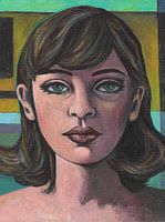 Een Pop-Art achtig geschilderd portret van een vrouw. Acryl op doek, 21 x 30 cm.