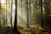 Vroege ochtendmist met de zonsopkomst die met prachtige zonneharpen door de bomen schijnt.