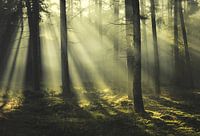 Zonnestralen schijnen door een groen bos en creëren een mooie vleugel van licht in de mist, Nederland.