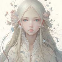Fantasie portret in aquarel stijl van een jong elfen meisje met wit haar en bloemetjes.