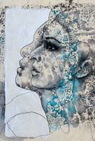 'Faith', een figuratief werk van zwart draad & verf op vilt waarbij èèn gezicht twee gezichten tot een geheel maakt. Het voorste duidelijk meer uitgewerkt dan het gezicht erachter. De kleur blauw staat voor vertrouwen & met de sfeer van stromend water, symbool voor gevoelens & emoties, is het werk kwetsbaar & krachtig.