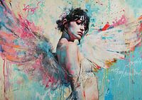 Details: vrouw, vleugels, introspectie, turkoois, roze, blauw, geel, street art, kwetsbaarheid, emotie, Warm glow