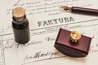 Detailansicht einer alten Rechnung, Faktura, aus dem Jahr 1915, dabei steht ein Tintenfass und liegen ein Federhalter und ein Tintenlöscher.