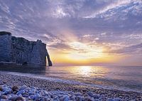 De rotsbogen van wit kalksteen en stranden bij Étretat is bekend bij velen. De beroemde bogen en de witte kliffen waren al lang geleden een inspiratiebron voor Claude Monet en andere impressionistische schilders in de 19de eeuw. Étretat lig aan de westkust van Frankrijk en laat het westen toevallig net de richting zijn waar de zon onder gaat. Deze elementen allemaal samen kunnen zorgen voor een prachtig plaatje.