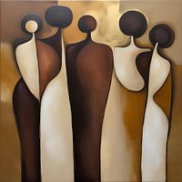 Een minimalistisch abstract schilderij in warme bruin-, beige- en goudtinten, waarin een familie van vijf wordt weergegeven in subtiele, gestileerde vormen. De figuren zijn verbonden door eenvoudige lijnen, waardoor een gevoel van eenheid en harmonie ontstaat. De ingetogen compositie en luxueuze kleurtonen stralen rust en warmte uit. Een verfijnd werk dat de essentie van samenzijn vangt met minimale details en maximale emotie.