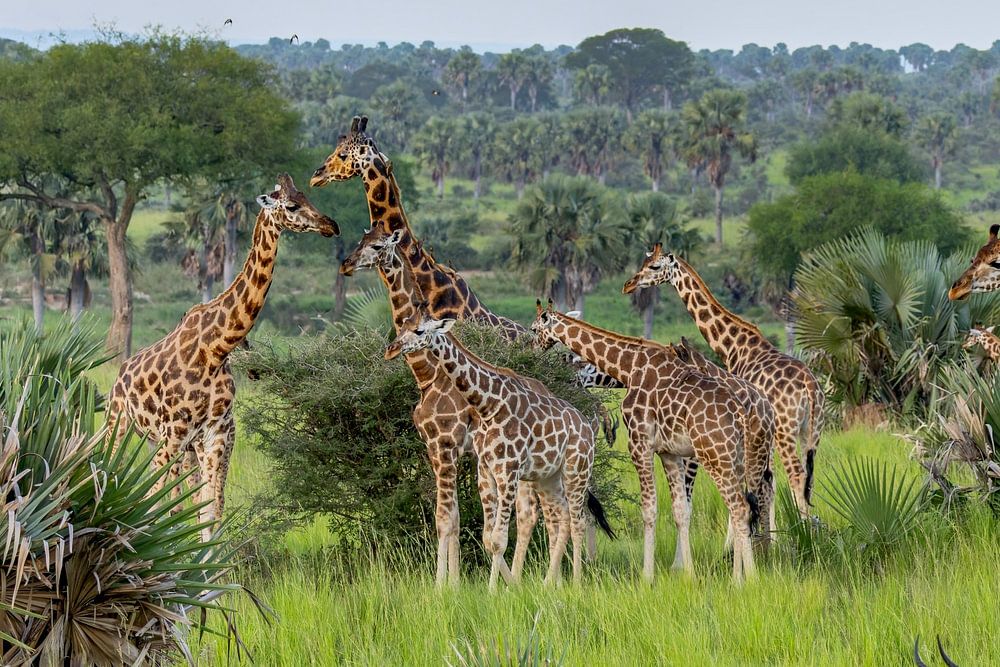 Het lijkt net het paradijs. Een grote familie giraffen loopt in het typische langschap van Oeganda. Met op de voorgrond twee Oegandese kob antilope en een groep vogels in de lucht.