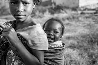 Jong Afrikaans meisje met haar broertje op haar rug met een doek. Haar baby broertje lacht vol uit. Zij is iets meer onderzoekend.