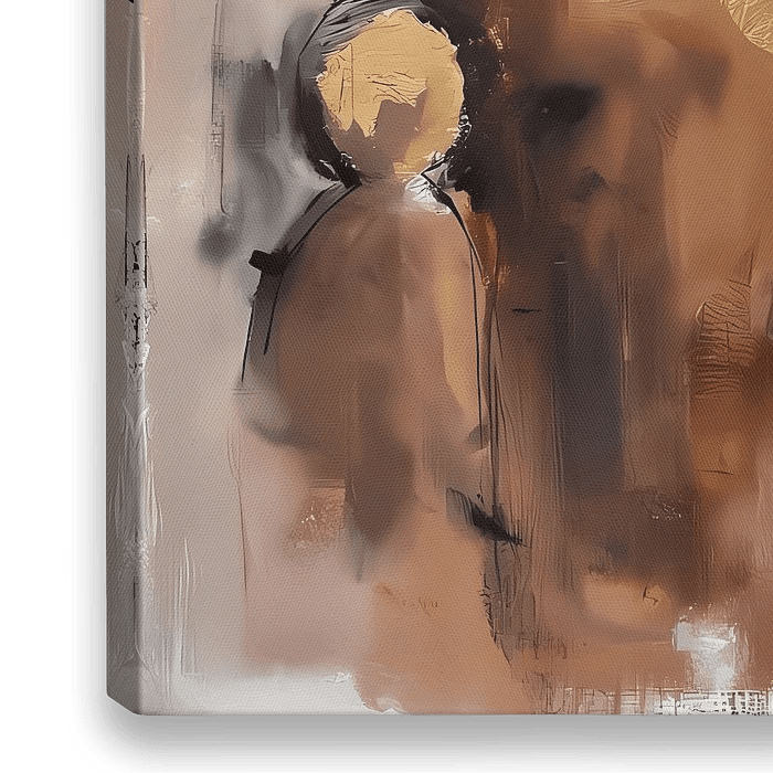 Dit schilderij toont een familie van vier in een abstracte, moderne compositie die doet denken aan een familieopstelling. Vier vormen staan in relatie tot elkaar, elk met een eigen plek en energie binnen het geheel. Warme bruin- en goudtinten verbinden de figuren en verwijzen naar oorsprong, waarde en onderlinge loyaliteit. De afstand…