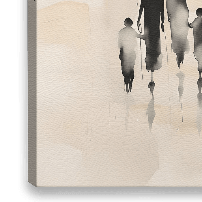 'Familie van vier abstracte tekening' is een tekening van gezin waarbij de ouders hand-in-hand zijn afgebeeld met hun twee kinderen. Er is gebruik gemaakte van waterverf, zwart-wit en beige tinten.