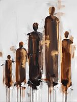 Dit schilderij toont een familie van vijf in een abstracte, moderne compositie die doet denken aan een familieopstelling. 5 vormen staan in relatie tot elkaar, elk met een eigen plek en energie binnen het geheel. Warme bruin- en goudtinten verbinden de figuren en verwijzen naar oorsprong, waarde en onderlinge loyaliteit. De afstand en…