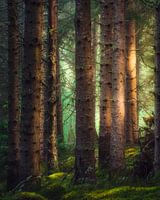 Deze foto roept een gevoel van warmte en rust op, ideaal voor een interieur dat natuurlijke elementen en een gezellige sfeer waardeert. Geschikt voor een woonkamer, slaapkamer of kantoor waar een kalmerende en inspirerende ambiance gewenst is. De techniek omvat het gebruik van natuurlijk licht en een zorgvuldige compositie om de diepte en texturen van het bos te benadrukken, wat bijdraagt aan de intieme en serene uitstraling van het beeld.
