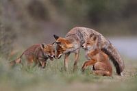 Een moervos met twee jongen welpen