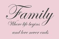 Dit hartverwarmende typografische kunstwerk met de tekst "Family, where life begins and love never ends" heeft een zachte roze achtergrond en krachtige donkergrijze letters, wat zorgt voor een warme en uitnodigende uitstraling. De roze tint creëert een gevoel van zachtheid en liefde, terwijl de donkergrijze letters de betekenisvolle boodschap duidelijk en gedurfd overbrengen. Het contrast tussen de lichte achtergrond en de donkere tekst maakt het ontwerp visueel aantrekkelijk en zorgt voor een balans tussen warmte en kracht.