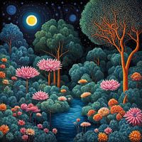 De scène zit vol intrigerende details: vloeiende lijnen en speelse patronen lopen naadloos over in abstracte structuren, waardoor een gevoel van beweging en diepte ontstaat. Elk element, van bizarre bomen tot betoverende bloemen, draagt bij aan een bijna hypnotiserende sfeer die uitnodigt tot verkenning. De kleurrijke paletten stralen energie uit, maar blijven harmonieus in balans, wat het werk zowel dynamisch als sereen maakt.
