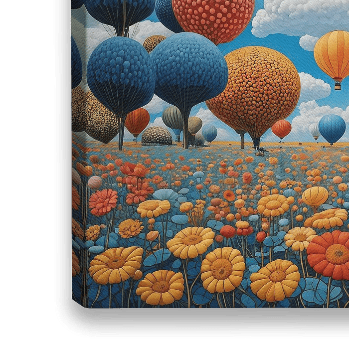 De scène zit vol intrigerende details: vloeiende lijnen en speelse patronen lopen naadloos over in abstracte structuren, waardoor een gevoel van beweging en diepte ontstaat. Elk element, van bizarre bomen tot betoverende bloemen, draagt bij aan een bijna hypnotiserende sfeer die uitnodigt tot verkenning. De kleurrijke paletten stralen energie uit, maar blijven harmonieus in balans, wat het werk zowel dynamisch als sereen maakt.