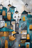Een fascinerend stadslandschap openbaart zich, de gebouwen schitteren in glinsterende tinten blauw en goud met hun gebogen daken en stralende ramen. De levendige achtergrond roept dromen en verhalen op en is perfect voor de woonkamer, waar het gesprekken stimuleert en een artistieke sfeer creëert.