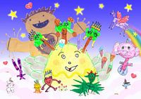 Wat gebeurt er toch eigenlijk boven de wolken? Nou, dit dus! Er is een levend eiland met mooie bomen, een eenhoorn die regenbogen maakt, dansende ijsjes en een groen monster met een lok-appel op z'n kop!
