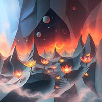 Levendige, gloeiende bloemen verlichten een surrealistisch landschap van grillige pieken tegen een sterrenhemel. Planeten en hemellichamen zweven erboven, wat bijdraagt aan de dromerige atmosfeer.