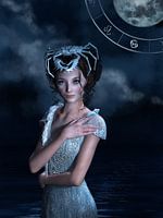 Sterrenbeeld Kreeft. Haar element is water, te zien op de achtergrond. Haar planeet is de maan.