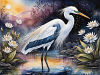Een reiger staat in een schilderachtig fantasie landschap. Aan de waterkant groeien witte bloemen en de zon gaat onder.