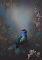 Een kleurrijke fantasie vogel zit op een tak in een donker bos omringd met bloemen. De afbeelding heeft een sprookjesachtige sfeer.