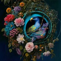 Een uitbundig boeket bloemen rondom een vogelhuis met daarin een blauwe vogel. Deze digitale afbeelding is gemaakt in de stijl van een oud bloemstilleven. Als je goed kijkt zie je twee vogels erin verstopt.