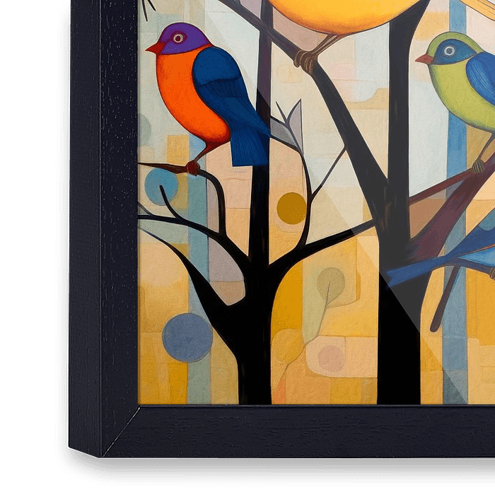 Enkele kleurrijke, ongewone vogels zitten in een boom, digitaal gegenereerd in een artistieke stijl.