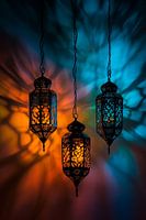 Zacht licht stroomt door artistieke lampachtige objecten die delicate schaduwpatronen op de muur werpen. De warme tinten oranje, blauw en goud creëren een uitnodigende sfeer. Ze zijn ideaal voor de woonkamer en geven de kamer een vleugje oosterse elegantie en gezelligheid, perfect voor ontspannen avonden met vrienden of familie.