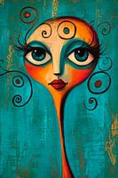Met zijn grote, expressieve ogen en fascinerende spel van oranje en turquoise kleuren trekt deze mysterieuze figuur onmiddellijk ieders aandacht. De speelse spiralen geven het beeld een levendige dynamiek die perfect past in een woonkamer en de kamer een charmante, creatieve sfeer geeft.