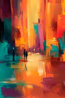 Een mysterieus stadslandschap ontvouwt zich in pulserende kleuren die energie en leven uitstralen. De vage silhouetten van mensen lijken te zweven in een droom van licht en reflecties. Dit levendige kunstwerk is perfect voor in de woonkamer om een gesprek op gang te brengen en een creatieve sfeer te creëren.