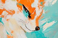 Een levendig samenspel van warme oranje tinten en koel aqua omlijst het ondeugende gezicht van een vos. Zijn intense ogen stralen intelligentie en nieuwsgierigheid uit, terwijl de dynamische penseelstreken een speelse energie overbrengen. Dit kunstwerk is perfect voor de woonkamer om een uitnodigend en creatief accent te creëren.