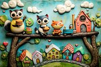 Deze prachtige wanddecoratie brengt een speelse en kleurrijke sfeer in iedere ruimte. Het ontwerp toont schattige dieren die op een boomtak zitten, omringd door een fantasiewereld met kleine huisjes, bomen en wolken. De levendige kleuren en gedetailleerde stijl maken dit kunstwerk perfect voor het opvrolijken van woonkamers,…