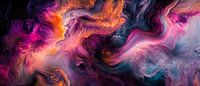 Een spectaculair kleurenspel van paarse, oranje en zachtblauwe tinten ontvouwt zich in fascinerende golven die doen denken aan een galactische nevelformatie. Deze dynamische en levendige kleuren brengen een zekere magie in de woonkamer door de verbeelding te stimuleren en een uitnodigende, creatieve sfeer te creëren.