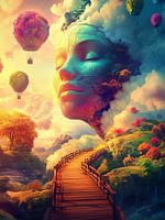 Dit kleurrijke kunstwerk toont een magisch landschap waarin een houten brug door een dromerig tafereel leidt. Hete luchtballonnen zweven boven het landschap, terwijl een reusachtig gezicht met gesloten ogen in de wolken lijkt te rusten. De levendige kleuren groen, oranje en roze creëren een warme en uitnodigende sfeer. De afbeelding…