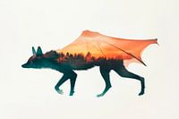Stel je een fascinerend wezen voor dat ontwaakt door de magie van de natuur. Een wolfachtig wezen met majestueuze vleugels glinstert in zachte oranje tinten en wordt omringd door een mystiek bos. Dit kunstwerk voegt een vleugje fantasie toe aan je woonkamer en stimuleert de verbeelding - perfect voor dromerige gesprekken en inspirerende momenten.
