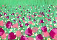 Kleurrijk schilderij van abstracte roze bloemen in een weids groen veld.