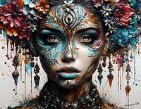 Een prachtig portret van een vrouw versierd met uitgebreide gezichtsdecoraties en een kroon gemaakt van verschillende kleurrijke bloemen. Ze straalt een etherische aura uit met ingewikkelde patronen en felle kleuren die haar gelaatstrekken accentueren, aangevuld met sierlijke sieraden om haar nek.