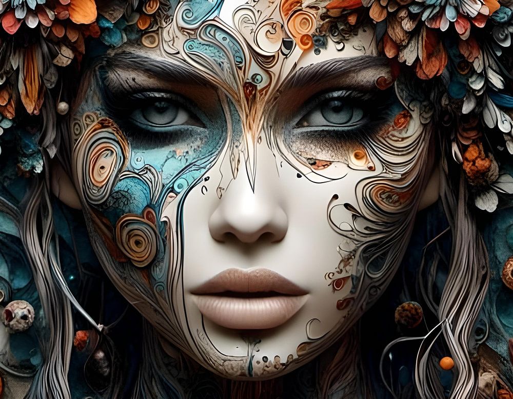 Een vrouwfiguur met opvallende gelaatstrekken is getooid met een complexe hoofdtooi van bloemen en decoratieve patronen. Haar gezicht is beschilderd met ingewikkelde ontwerpen en haar uitdrukking is sereen en mysterieus.