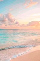 Zachte golven kabbelen over het fijne zandstrand, terwijl de lucht oplicht in zachte pastelkleuren. Wolken, zo zacht als suikerspin, drijven vredig over de horizon terwijl de zon langzaam afscheid neemt van de dag. Een sfeer van vrede en harmonie verspreidt zich en nodigt je uit om te ontspannen.