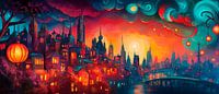 Een gloeiend stadslandschap in levendige kleuren voert je mee naar een droomachtige fantasiewereld. Gloeiende lantaarns en mystieke wolken creëren een magische sfeer bij zonsondergang. Dit kunstwerk is perfect voor de woonkamer om bezoekers in een magische stemming te brengen en een uniek gespreksonderwerp te bieden.