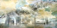 Dynamische Digital-Art Skyline von Manhattan, New York City. Eine Möve fliegt über die Szene. Modernes und dekoratives Werk in angenehmen leichten Farben.
