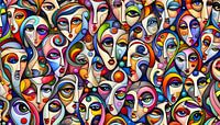 Een zeer kunstzinnig apart kleurrijk beeld. We zien grappig gevormde gezichten in allerlei kleuren. Een bijzondere en unieke creatie! Je zou dit werk kunnen omschrijven als 'maf' of 'goofy'. En ja, dat is het ook. Het wordt een absolute moderne blikvanger aan een muur!