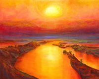 Over het geheel genomen drukt dit schilderij de schoonheid van de natuur en de vergankelijkheid van het moment uit. Het herinnert de kijker eraan om de wonderen van de natuur en de magie van een zonsondergang te waarderen. De scène nodigt ons uit om ons onder te dompelen in de rust en majesteit van de natuur en de innerlijke rust te vinden die het biedt. Het is een uitnodiging om te genieten van de schoonheid van de avond en de zonsondergang en om de momenten van stilte en contemplatie te midden van de drukte van het leven te waarderen.