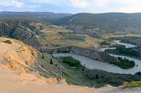 Farwell Canyon is prachtig gelegen in de Chilcotin. Langs de Chilcotin River ligt de verlaten Pothole Ranch. Op deze foto zie je hem in het midden aan de rechterkant. In de canyon kan het 5 graden warmer zijn dan bij de snelweg. Wat ik mooi vind aan deze foto, is de kronkelige weg links en de kronkelige rivier aan de andere kant.