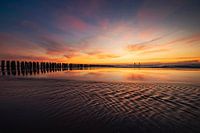 De lucht kleurt prachtig na zonsondergang en wordt weerspiegelt in het zand, aan het strand van Domburg.