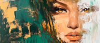 Een fascinerend samenspel van zachte kleuren en expressieve ogen vangt de kijker. De mix van levendig groen en warme aardetinten geeft het gezicht een mysterieuze diepte. Deze kunst is ideaal voor in de woonkamer en zorgt voor levendige gesprekken en creatieve inspiratie. Creëer een sfeer van aantrekkingskracht en verwondering!