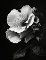 De abstracte muurschildering toont een fascinerende vrouw met een uitzonderlijk grote bloem op haar hoofd, die bijna de helft van haar gezicht bedekt. Deze unieke afbeelding creëert een bijzondere dynamiek tussen verhulling en onthulling.