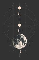 Een harmonieus spel van licht en schaduw ontvouwt zich met de zachte fasen van de maan, die in kunstige cirkels zijn gerangschikt. De grote, stralende maan in het midden trekt ieders aandacht, terwijl de delicate nuances van de maansikkel haar mysterieuze allure omlijsten. Deze compositie wordt gekenmerkt door een fascinerend samenspel van natuur en mystiek.