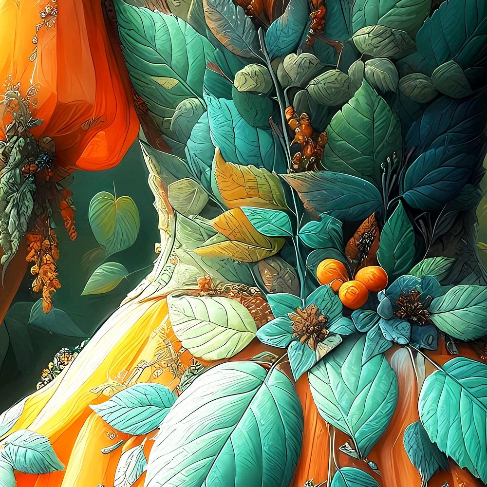 A woman stands in a garden wearing a dress intricately adorned with vibrant leaves and foliage. The design blends the natural elements seamlessly into the fabric, creating an enchanting, nature-inspired ensemble.