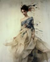 Fashion portret van een jonge vrouw in een prachtige jurk in pastelkleuren. Met dit werk plaats je echt een statement aan je muur! Exclusief gemaakt voor en te koop bij Werk aan de Muur.